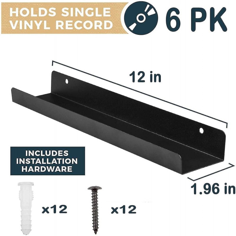 Set of 6 clear vinyl record shelves measuring 30.5 x 4.3 x 5 cm with 12 mounting screws. They are transparent to highlight the album art, so you can easily see it once the album is installed. A must-have for music lovers who need a stylish display system for large vinyl record collections.