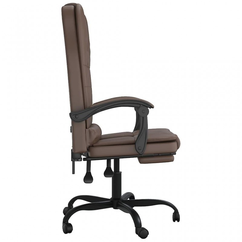 Color: Brown. Material: Faux leather (75% polyvinyl chloride, 5% cotton, 20% polyester), metal, plywood. Filling: Foam. Overall dimensions: 63 x 56 x (112.5-122) cm (W x D x H). Reclined dimensions: 63 x 128.5 x (100-109.5) cm (W x D x H). Seat surface: 51 x 44 cm (W x D). Seat height from the floor: 46.5-56 cm. Armrest height from the floor: 67.5-77 cm. Input voltage: DC 5V. Input current: 2A.