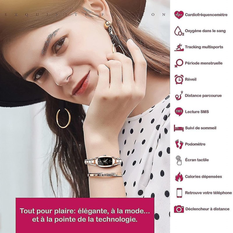Smart Watch & Health Tracker This smart watch allows you to accurately record all-day activities, such as steps, distance traveled, calories burned, heart rate, sleep status, and much more. This smart watch supports multiple sports modes. Something to keep you motivated all day long. This smart watch is a great gift option. Call & Message Notifications These smart watches (rose gold or silver) will vibrate when you receive incoming calls or messages (Facebook, Twitter, WhatsApp, Line, Skype, Twitter, WeChat, etc.). You will be able to see the message content directly on the watch. If you are busy, you can hang up the call directly. These stylish, high-tech IP67 women's watches have the smartest features on the market, such as synchronized weather forecasts, sedentary reminders, a vibrating alarm clock, full music and camera control, and control your phone through the watch screen, a stopwatch, brightness adjustment (raise your wrist to brighten the screen), magnetic fast charging, and more. More than just a women's watch This smartwatch uses a 1.09-inch (2.54 cm) IPS HD touch screen and is made of stainless steel to give you a better experience - all for a stylish look. Blood pressure, blood oxygen levels and menstrual cycle are also part of this watch's applications: you will have complete monitoring. Long battery life and wide compatibility The women's Bluetooth watch is compatible with Android 4.4 or IOS 8.0 and above (Bluetooth 4.0 or above is required), it is only suitable for smartphone connection, not for PC, iPad, tablet. Scan the QR code or download/install the "F Fit" APP from your mobile app store. Open it and turn on Bluetooth. Click "Add device" and select the watch. Enjoy